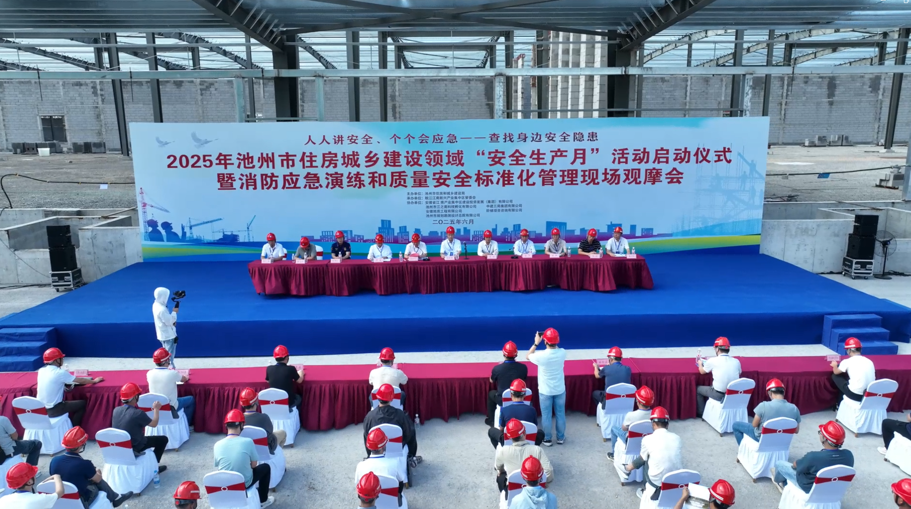 近日,《2025年池州市住房城鄉(xiāng)建設(shè)領(lǐng)域“安全生產(chǎn)月”活動(dòng)啟動(dòng)儀式暨消防應(yīng)急演練和質(zhì)量安全標(biāo)準(zhǔn)化管理現(xiàn)場(chǎng)觀摩會(huì)》在集團(tuán)所屬地質(zhì)公司承建的“京東云倉(cāng)EPC項(xiàng)目”現(xiàn)場(chǎng)隆重舉行。副市長(zhǎng)胡軍保、集中區(qū)管委會(huì)副主任張平、市住建局局長(zhǎng)付四九及三縣一區(qū)住建安全部門(mén)和企業(yè)代表共同參與此次活動(dòng)。