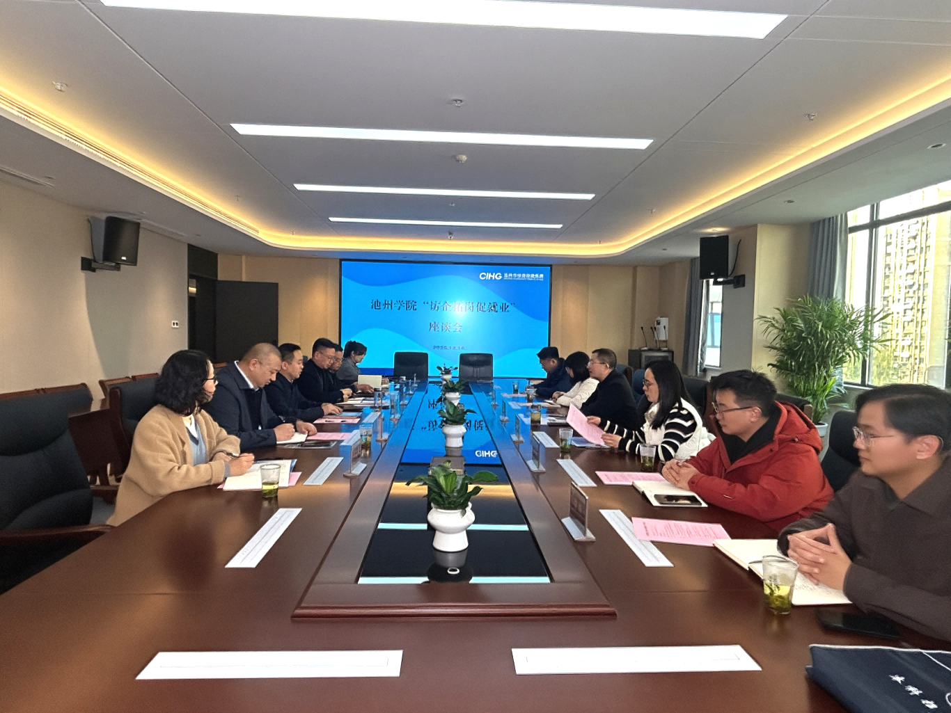12月16日下午,池州學院地理與規(guī)劃學院院長張樂勤一行赴集團開展“訪企拓崗促就業(yè)”活動,集團黨委委員、副董事長黃代熱情接待并座談交流。集團人力資源部及二級集團負責人、池州學院地理與規(guī)劃學院各系主任參加座談交流。