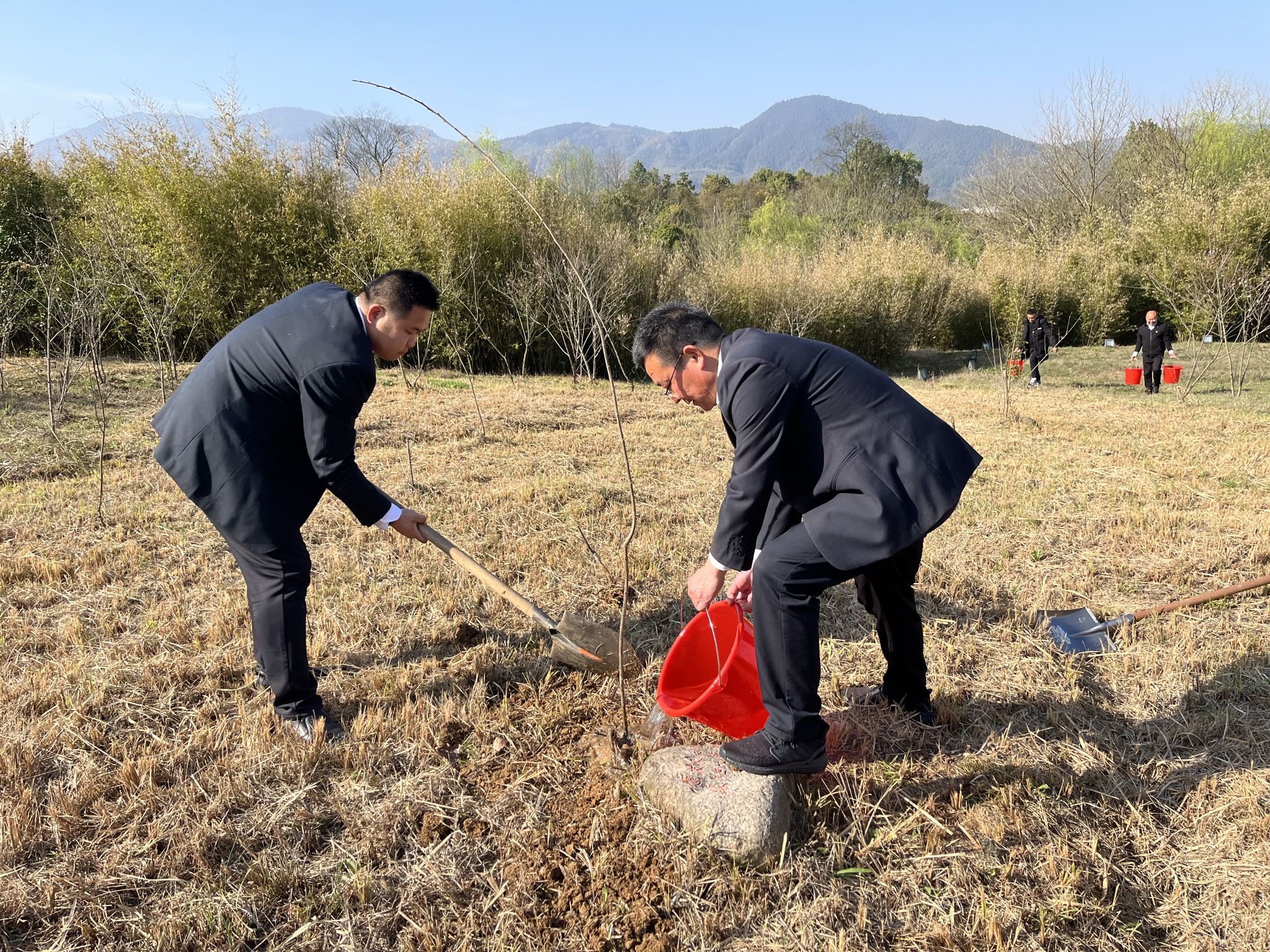 植樹現(xiàn)場(chǎng),大家干勁十足,熱情洋溢,分工明確,密切配合:有的揮鋤挖坑,有的扶苗培土,有的運(yùn)水澆水……畫面溫馨積極,處處都是忙碌的身影。