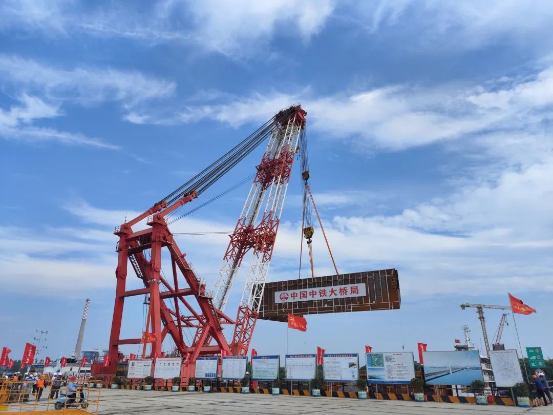 據(jù)悉,南主塔墩(4號(hào)墩)圍堰采用雙壁鋼套箱結(jié)構(gòu),總高29米,總重約5558.32噸,共分為四節(jié)吊裝,本次吊裝安裝完成的是底節(jié)圍堰,平面尺寸為80.2米×52.2米,高9米,占地面積相當(dāng)于10個(gè)標(biāo)準(zhǔn)籃球場(chǎng),高度相當(dāng)于3層樓房。其共分為4塊運(yùn)輸和安裝,單塊重量高達(dá)226.2噸。鋼圍堰在工廠制作完成后,通過(guò)自航式甲板貨船經(jīng)320公里的水上運(yùn)輸,到達(dá)指定橋位吊裝下放。