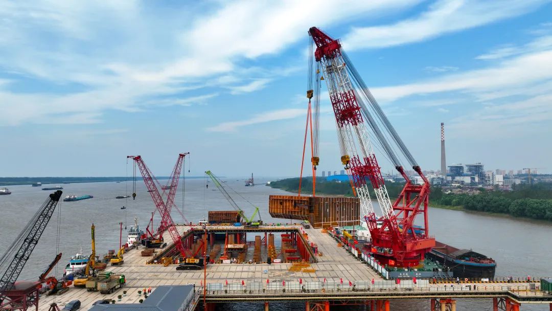 大橋按照“公路+城際鐵路+城市軌道交通”合并過(guò)江的標(biāo)準(zhǔn)建設(shè)。上層作為寧樅高速公路的過(guò)江通道,按雙向6車道布設(shè),設(shè)計(jì)時(shí)速100公里;下層承載兩線合池城際鐵路,設(shè)計(jì)時(shí)速250公里;預(yù)留兩線池銅市域鐵路,設(shè)計(jì)時(shí)速160公里。池州長(zhǎng)江公鐵大橋共設(shè)計(jì)有 42 個(gè)橋墩,其中3號(hào)、4號(hào)墩為主塔墩,均位于離岸長(zhǎng)江水域。7月26日,南主塔墩(4號(hào)墩)基77根樁基完成,本次下放的首節(jié)鋼圍堰為樁基上部銜接部分。