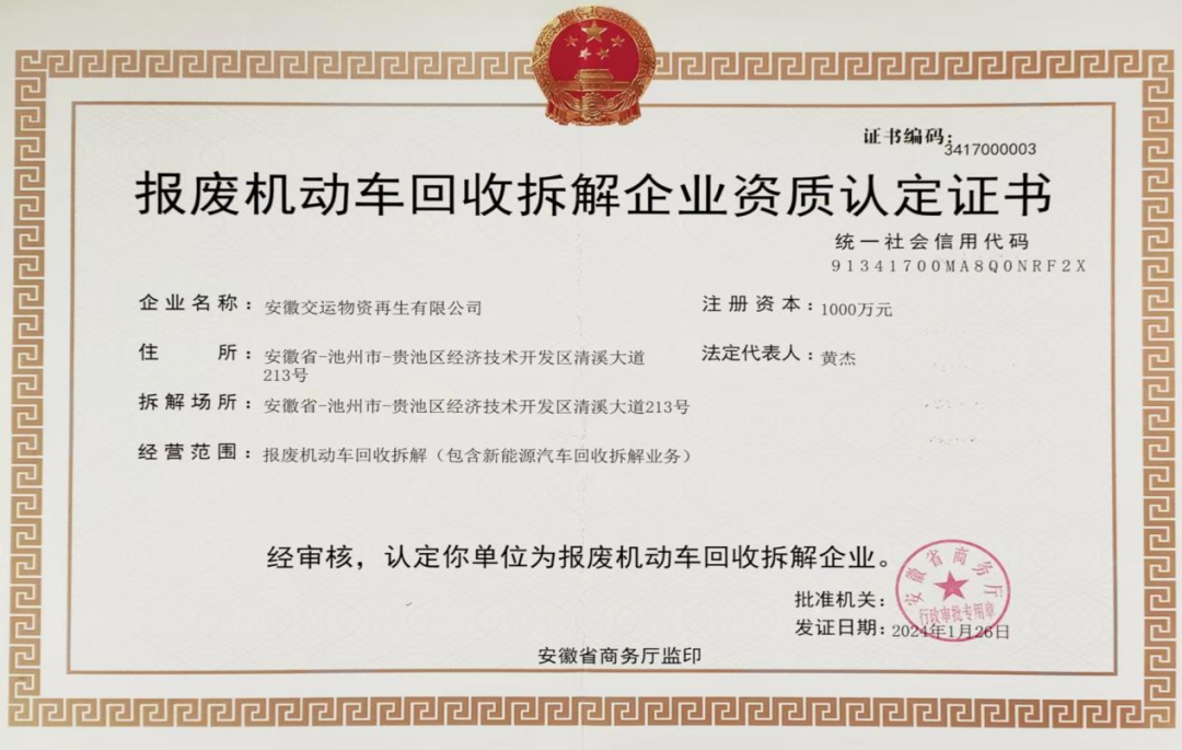近日,集團(tuán)所屬安徽交運(yùn)物資再生有限公司順利通過安徽省商務(wù)廳批準(zhǔn),成功獲得報(bào)廢機(jī)動(dòng)車回收拆解企業(yè)資質(zhì)認(rèn)定證書 。