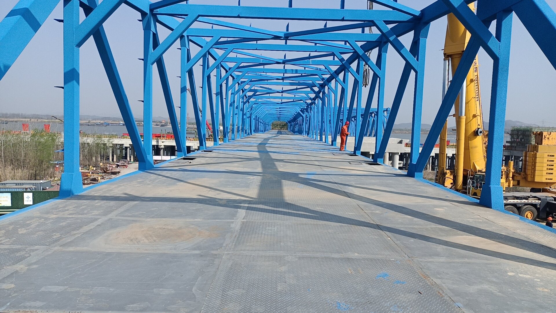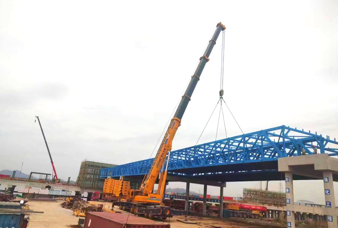 此次吊裝的兩座鋼引橋長度均為54.6米,8米寬型重108噸,12米寬型重163噸,屬超危大工程,且引橋橫跨長江大堤,坡頂?shù)狡履_的坡度小,存在“場地小、機械多、人員多、工序多”的情況,進一步增加了安全風險和施工難度。