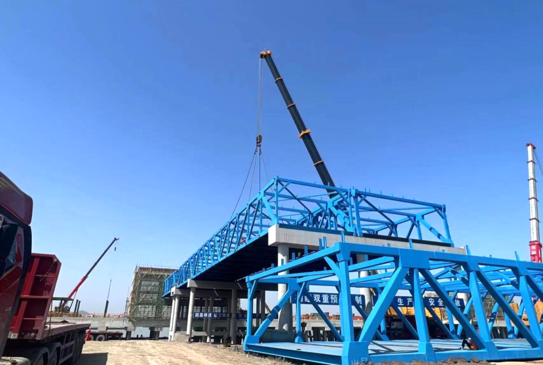 3月22日,烏沙港跨堤段鋼引橋安全平穩(wěn)吊裝至指定位置,安裝精度符合設(shè)計要求,經(jīng)過近二十個小時的奮戰(zhàn),跨堤段鋼引橋吊裝成功,為水域部分與陸域部分搭建了“橋梁”。